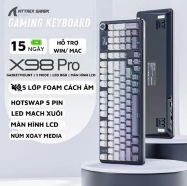 Ziyoulang Attack Shark X98PRO (Night) là phiên bản màu tối huyền bí của dòng X98PRO – với tông đen – xám – keycap nhấn cam hoặc đỏ trầm, kết hợp đèn RGB nổi bật trong bóng tối. Thiết kế đậm chất gamer, cấu hình mạnh với switch cơ học hot-swap, LED RGB đa hiệu ứng, 3 chế độ kết nối, phù hợp cho cả chơi game và làm việc chuyên nghiệp.