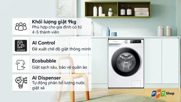 Khối lượng giặt 9 kg: Phù hợp gia đình 3–5 thành viên, giặt nhanh chóng và hiệu quả.